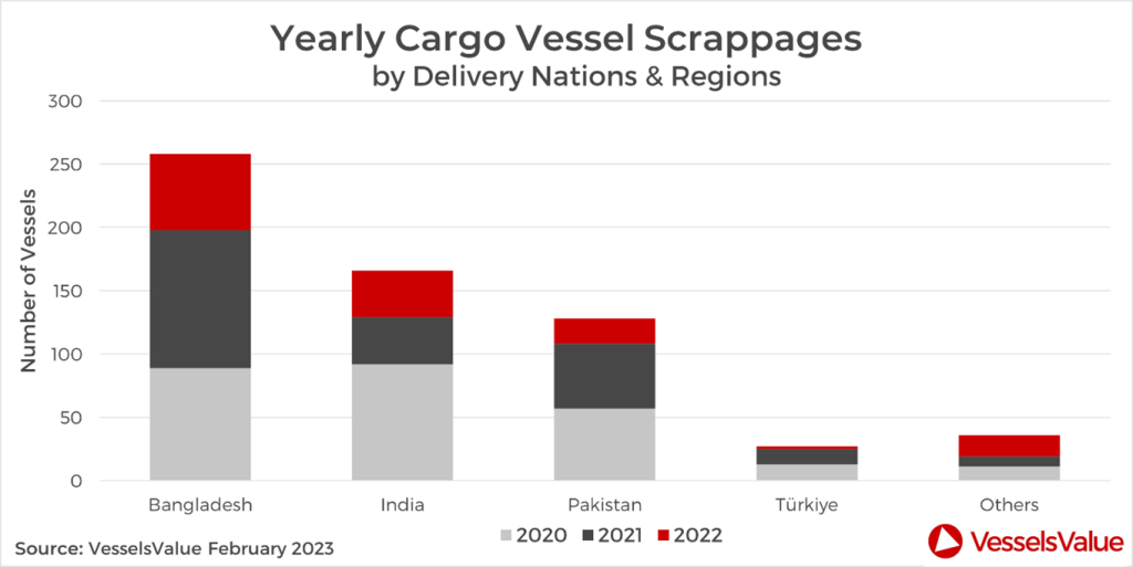 In 2022, it was Bangladeshi breaking yards that worked the hardest, demolishing 54 ships, accounting for approximately 42% of vessels sold for recycling. India was close behind, accounting for approximately 30% of scrapping activity, with 38 vessels sent for demolition, followed by Pakistan, which received only 19 vessels for demolition, accounting for 15% of scrapped vessels. Turkiye ranked fourth at 2% of the total vessels recycled, accounting for 2 vessels. The remaining 11% were removed in China, South Korea, Denmark, and the US.