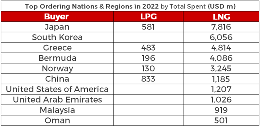 Japan led the way in terms of 2022 LNG sector investment, knocking Greece from the top spot. They take the lead for LNG orders totalling 44 vessels, worth c.USD 6.5 bn an increase of c.309% YoY in terms of value.