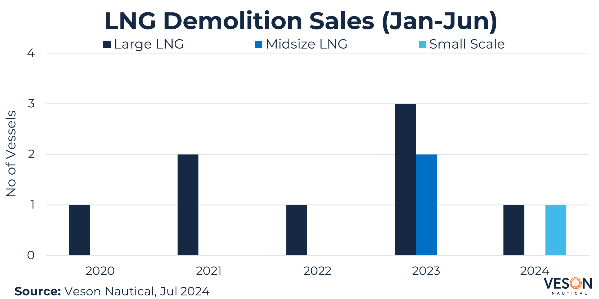 There were two vessels sold for demolition in 1H24, one large LNG and one Midsize LNG vessel. Based on the historical demolition sales, there is nothing out of the ordinary. The LNG fleet is relatively young and therefore seeing few vessels sold for scrap. The two vessels were: