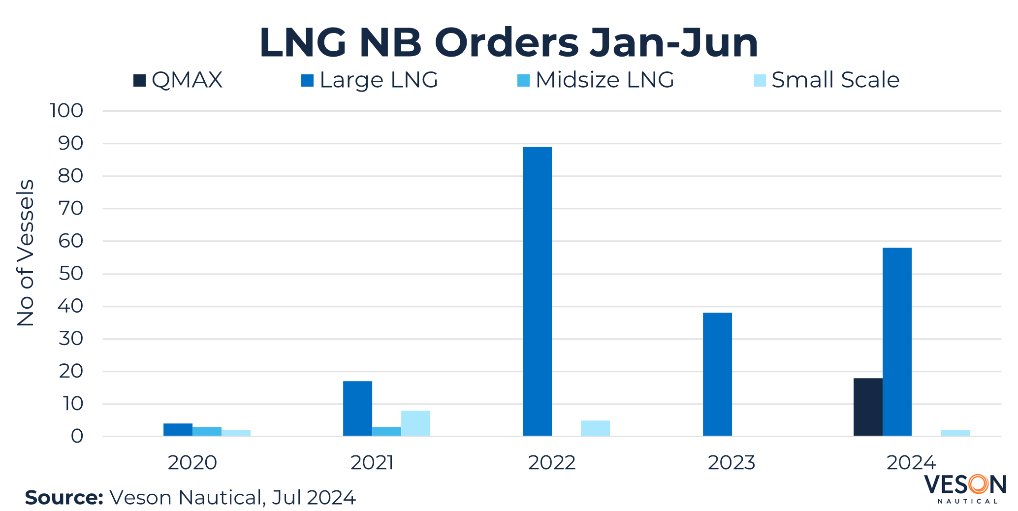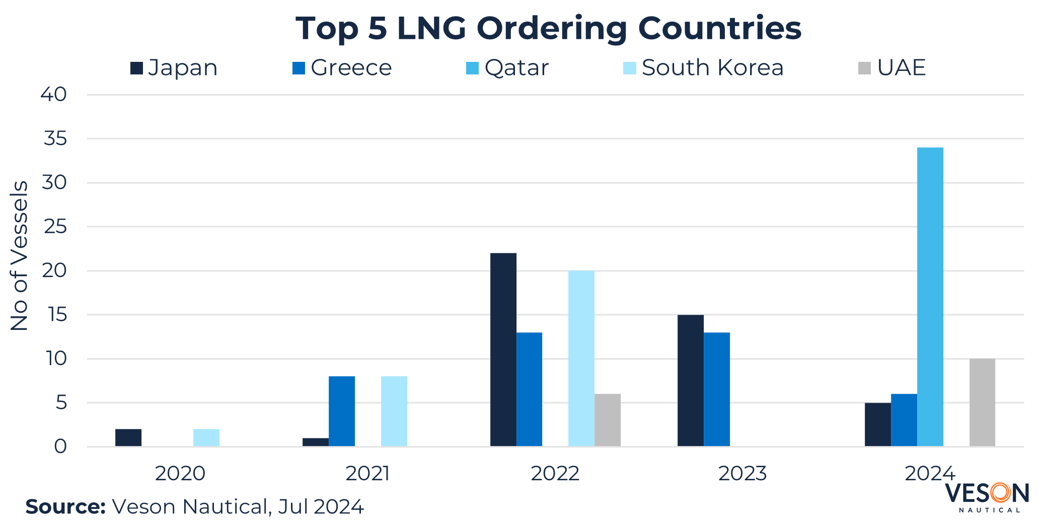 Qatar was the top buying country for newbuildings in 1H24 with astonishing 34 vessels. These vessels are linked to the LNG production expansion in the coming years, which will boost Qatar’s LNG production to 142 MTPA by the end of 2030. UAE and Greece have ordered 10 and 6 vessels respectively.