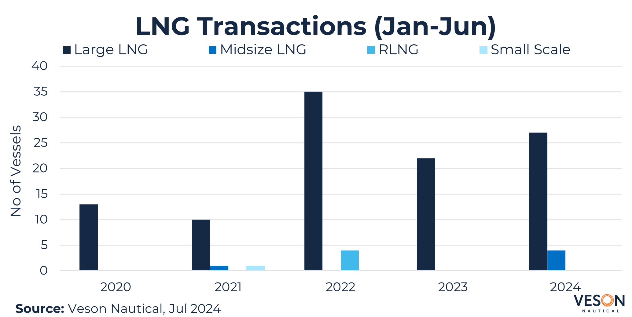 Looking at the S&P made in the first half of this year, we can see that most transactions were made in the Large LNG sector, which is in line with what we have seen in the past five years. Total S&P transactions were 31 vessels in 1H24, a 41% increase from the same period last year.