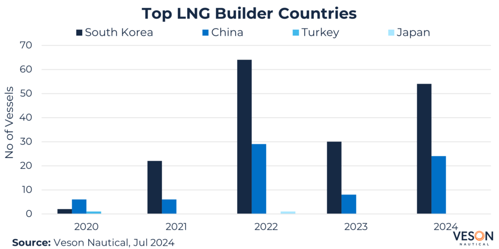 South Korea is still dominating newbuildings for LNG vessels in 1H24 and has 69% market share, China is covering the remaining orders of 24 vessels (31%). Despite seeing China taking a bigger proportion of newbuilding orders at the expense of South Korea and Japan, the majority for both LPG and LNG vessels are still being built in South Korea.