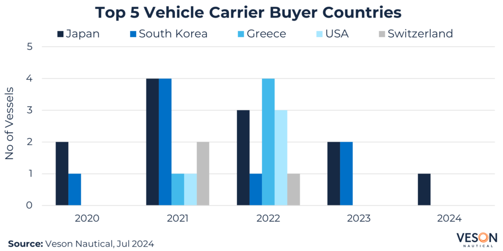 Focusing on five years of first half year data by buyer countries, Japan are top (12 vessels), followed by South Korea (8 vessels) and Greece (5 vessels). However, China is challenging the status quo after Changjiu Logistics acquired their second PCTC, and ICBC Financial Leasing concluded a refinance deal on CMA CGM Daytona (7,050 CEU, Apr 2024, Jinling Shipyard Jiangsu) in February.