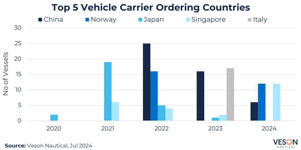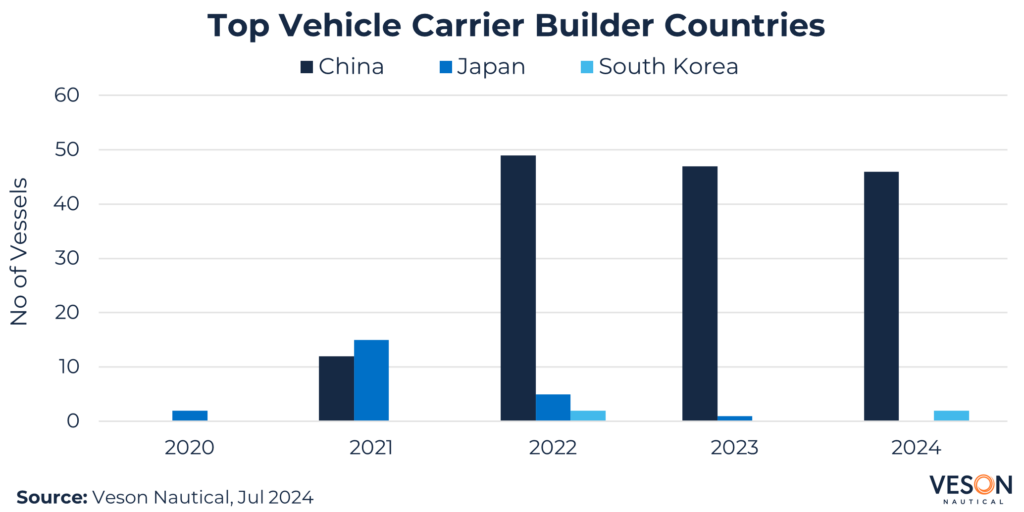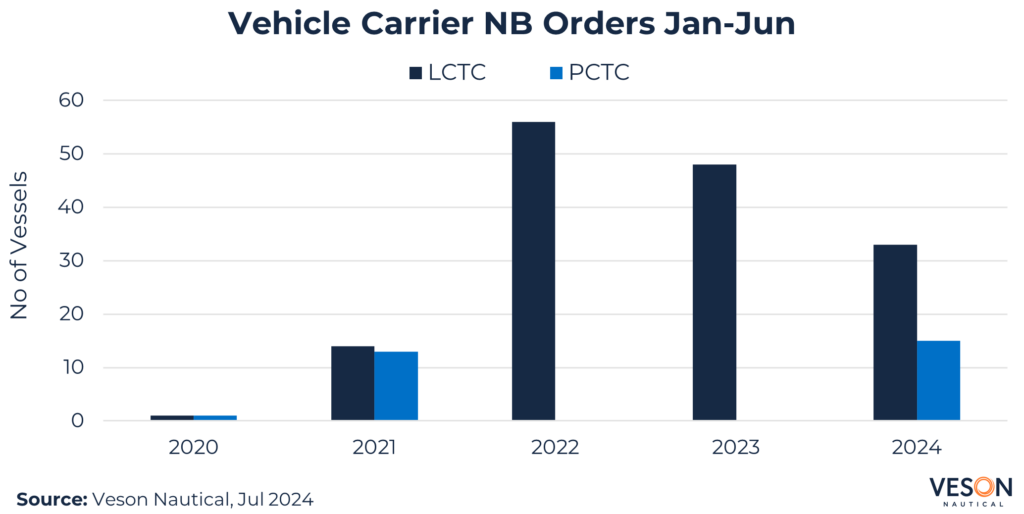 Chinese shipyards continued to dominate, taking c.96% of all orders in 1H 2024 based on 46 vessels including options; a repeat of the previous year supported by increased investment by OEMs SAIC, Chery, and BYD.