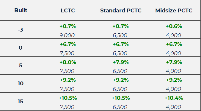 Focusing on midsize PCTCs, which comprise a marginal share of the c.41% orderbook, Eastern Pacific Shipping Pte.Ltd. (EPS) confirmed deals for 6 x 5,500 CEU Dual Fuel LNG units from China Merchants Jinling Shipyard (2 vessels) and Fujian Mawei Shipyard (4 vessels), paying USD 80 mil and USD 85 mil per vessel with repeat options.