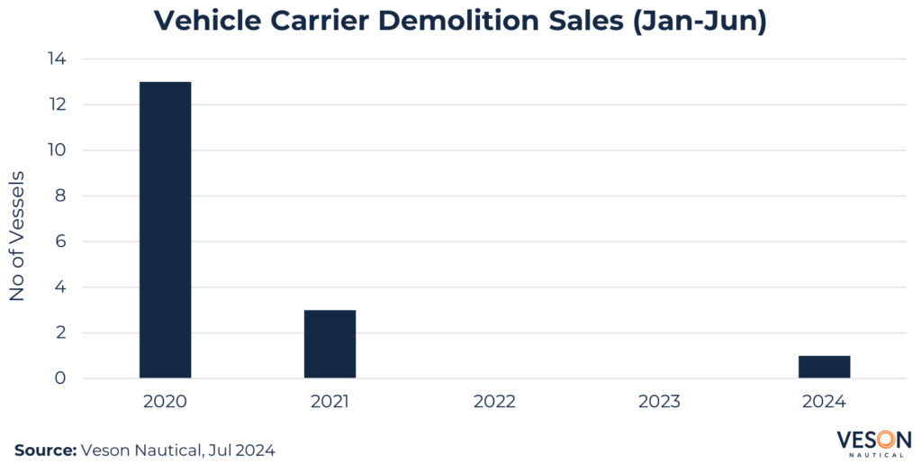 Vehicle carriers remained hot property in 1H 2024 because demand continued to outpace supply following strong light vehicle export growth from Asia, forecasting +6.6% for 2024, supported by a prolonged Red Sea crisis increasing sailing distances around the COGH that ensured supply kept low with no obvious end in sight.