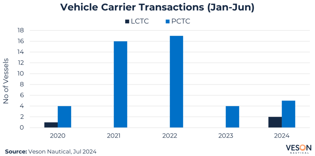 Second-hand sales activity remained subdued, recording 7 deals in 1H 2024 including two purchase options exercised by Wallenius Wilhelmsen and Hoegh Autoliners, broadly in line with the previous year. The headline transaction on the open market involved: