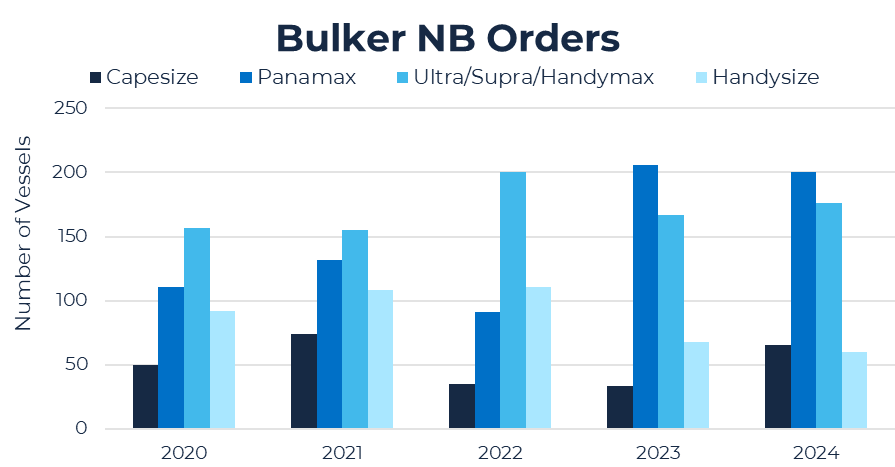 - The newbuilding market experienced continued growth, with a notable rise in orders, particularly in the Post/Panamax and Capesize sectors. Chinese dominance in both ordering and shipyard production remains a defining trend, further consolidating their position in the Bulker industry.