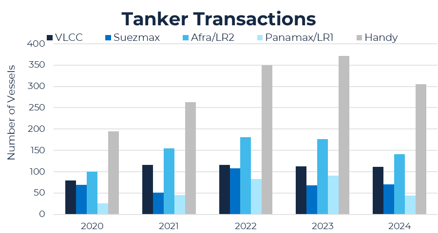 - In the Tanker sector, the secondhand sale and purchase market has seen a decline in activity compared to previous years, as high values and market uncertainty has tempered enthusiasm among buyers.