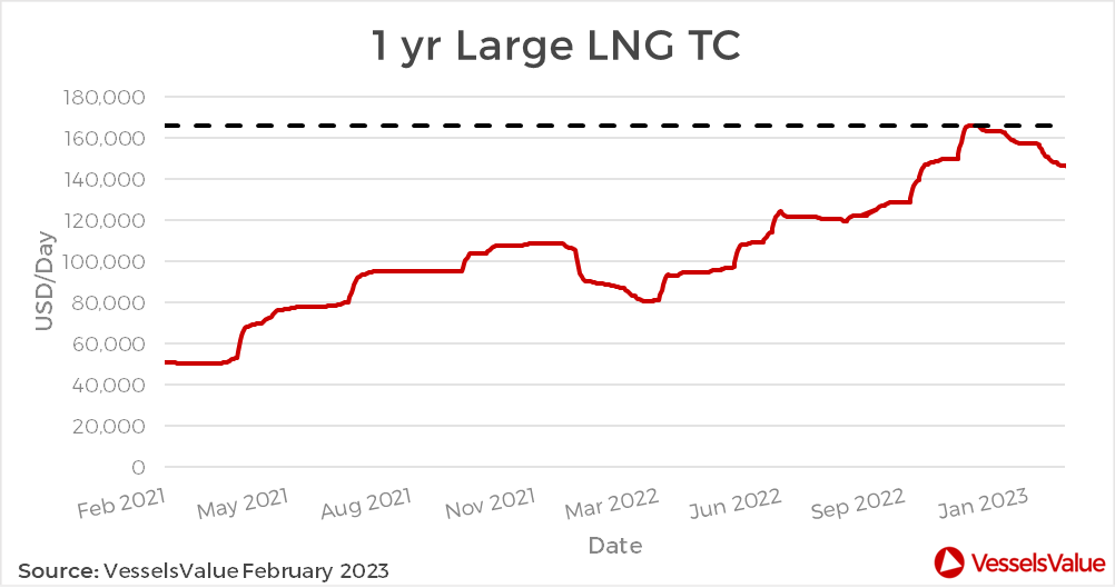 The strong demand is also reflected in 1 year Time Charter rates, which are shown in Figure 1. The VV 1 year Large LNG TC rate reached a 10 year peak of 163,209 USD/Day in November 2022.
