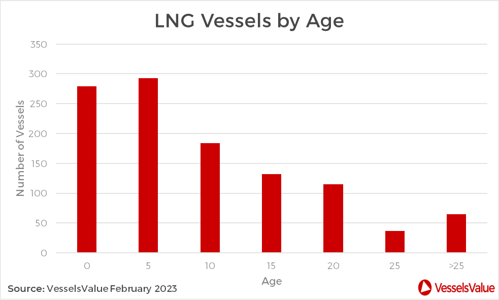 LNG’s popularity as a fuel has increased substantially over the last decade, and as a result, the LNG carrier sector has seen substantial growth. The number of newbuild orders placed every year has been increasing steadily since 2019, with the data showing a clear upward trend over the last 20 years. The current LNG fleet is therefore extremely modern, with the majority of vessels less than five years old.