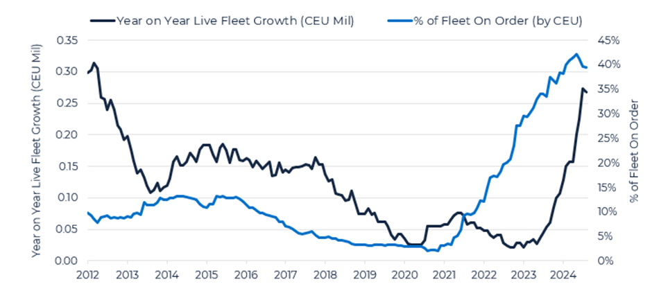 This all adds up to a volatile 2025 for the car carrier sector. A bulging 39% orderbook to live fleet ratio will inject a whopping 11% net supply uptick in 2025 which will have a deep impact.