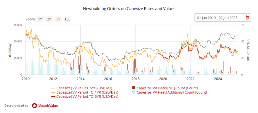 In summary, the historical orderbook remains one of the clearest indicators of where rates are headed. For Capesizes, the sharp drop in new orders seen over the past year has not translated to improvements in rates, largely due to weaker demand drivers and limited vessel removals. But as the effects of reduced ordering and low fleet renewal begin to play out, pressure on the supply side is likely to build, highlighting the value in using historical orderbook trends to anticipate shifts in both earnings and asset values.