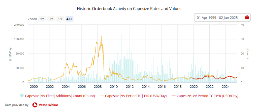 Using VesselsValue Timeseries, we examine how historical orderbook trends have influenced time charter (TC) rates and asset values for the Capesize segment. The data visualisations underscore the importance of tracking orderbook activity as a key driver of future fleet supply. This supply, in turn, directly impacts earnings potential across the fleet.