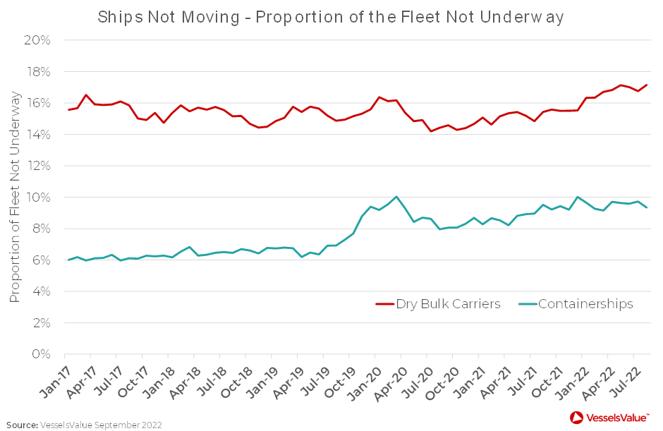 The summer months of 2022 have seen a slow motion collapse in freight rates for both Dry Bulk Carriers and Containerships. For the former, the Capesize 54-TCA Index fell from USD 38,169 per day on 23 May 2022 to just USD 2,505 per day on 31 August 2022 and, for the latter, the Asia to US West Coast box rate slid from USD 7,900 per FEU on 16 May 2022 to USD 3,959 per FEU on 06 September 2022.