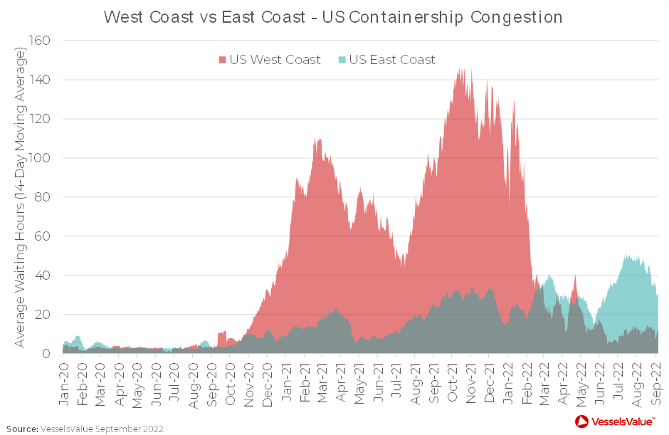 However, US East Coast ports were not immune to the parallel problems of staff absences and household’s rising demand for goods. Such was the heightened strain on New York, Savannah, and others, that, as average waiting times on the US West Coast eased back down to under 12 hours at time of writing, they ballooned to 51 hours on the US East Coast in August 2022.