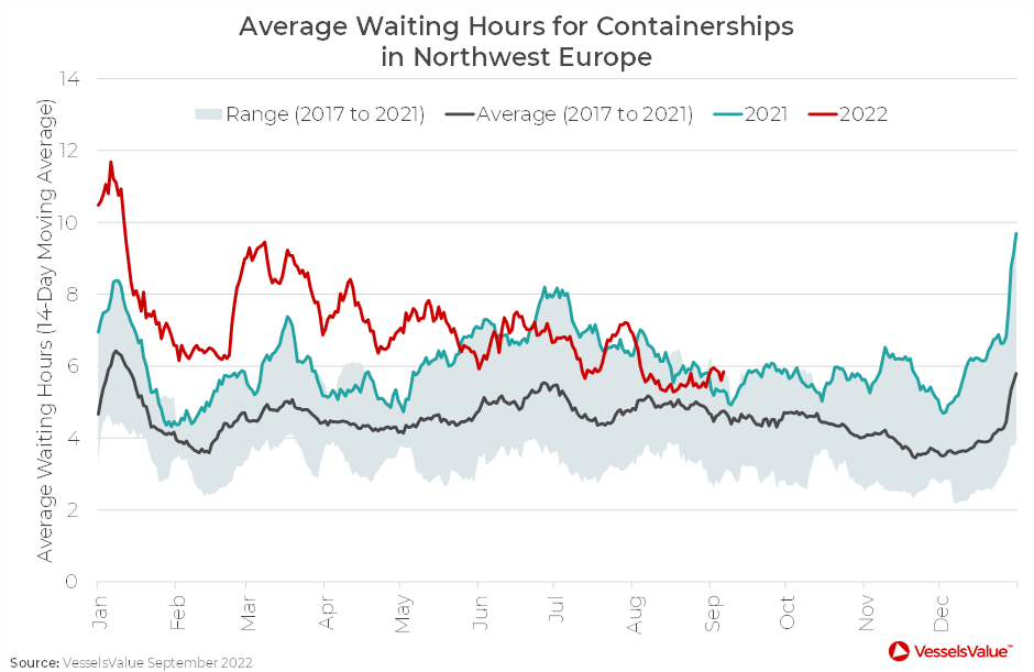 As shown in Figure 5 below, neither July 2022’s strikes in Germany nor August 2022’s one at Felixstowe have yet significantly impacted average waiting times for Containerships in Northwest Europe, though they are flirting with the top end of the historic range. Strikes present a slightly different problem from staff absences early in the pandemic. Empty containers continue to be returned to the port by truck and train but, with no vessels to repatriate them, shoreside space fills up with “empties”. It will therefore take several weeks to evacuate the surplus following the conclusion of the strike and average waiting times may yet trend higher, tying up tonnage and reducing the productive capacity of the fleet.