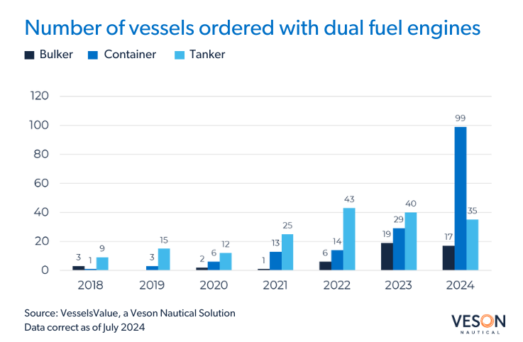 Of the vessels built globally since 2018, c.5% of them have been fitted with dual-fuel capabilities in a push to meet the latest targets set by the International Maritime Organization. This figure has grown across all sectors from a total of 13 in 2018 to 151 set to be delivered by the end of 2024. If we compare this to the number of vessels built in 2023 where a total of 88 dual-fuel vessels were completed, this is an increase of c.72% year-on-year.