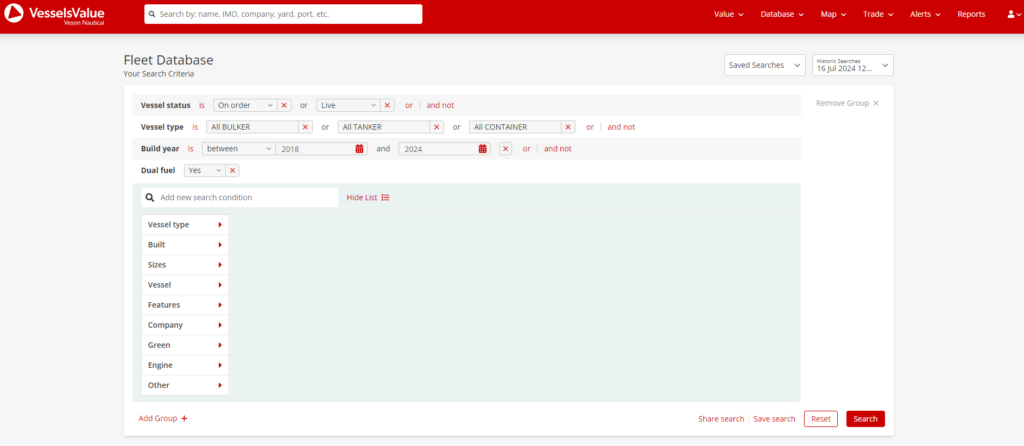 Fleet Database’s smart search function allows you to filter by specific features across ship types. The example above shows a search for dual-fuel capacity for Bulkers, Tankers and Containers.