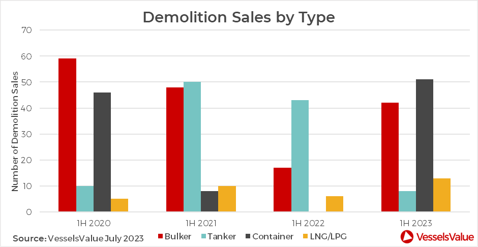 In the first half of 2023, 114 vessels were sold for scrap, a 73% increase over the same period in 2022. 51 tankers were scrapped, accounting for approximately 44.7% of all cargo vessel demolition in the first half of 2023.