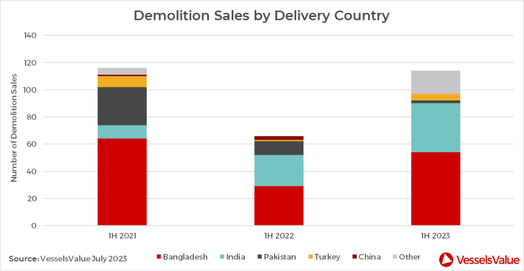Bangladesh has accounted for approximately 47.3% of demolitions in 2023 to date, India followed with a share of c.31.6%. Turkey ranked third, with a share of c. 4.4%, overtaking Pakistan where only two vessels has been scrapped so far this year, compared to 10 in 1H 2022.