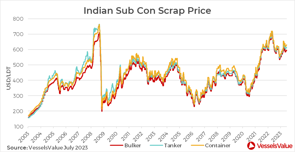 The rising scrapping numbers are a direct result of historically high scrapping rates, which reached historic highs in 2022. Despite some volatility, container scrapping prices remained at very high levels in the first six months of 2023, peaking at 655 USD/LDT in April.