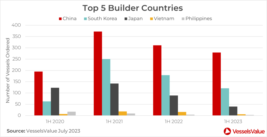 Chinese yards held the top rank as the most popular choice for newbuildings, accounting for 279 orders placed in 1H 2023, around 62.1% of newbuilding orders placed in 1H 2023, with the majority of these orders in the Bulker sector. South Korea ranked second, accounting for 27% of orders with 121 orders placed. Japan was once again in third place with c.8.9% although this share has dropped from c.14.8% last year as yard slots are set to remain busy with Container orders for the next few years. Vietnamese yards represented c.1.3% of orders and the Philippines c.0.6%.