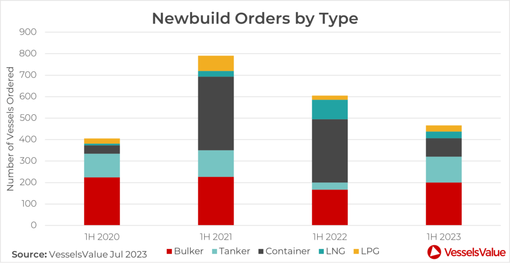 Overall vessel orders have cooled this year as the amount of Container and LNG orders has reached a saturation point. Container contracts have declined from 295 in the first half of 2022 to 86 so far this year and LNG contracts have fallen from 91 to 32. Instead, Bulkers have taken the top spot with orders increasing by c.20% year on year from 167 in 1H 2022 to 200 in the 1H 2023. Tanker orders have seen the most growth year on year, increasing by c.263.6%. LPG orders have grown by c. 47% year on year, from 19 to 28.