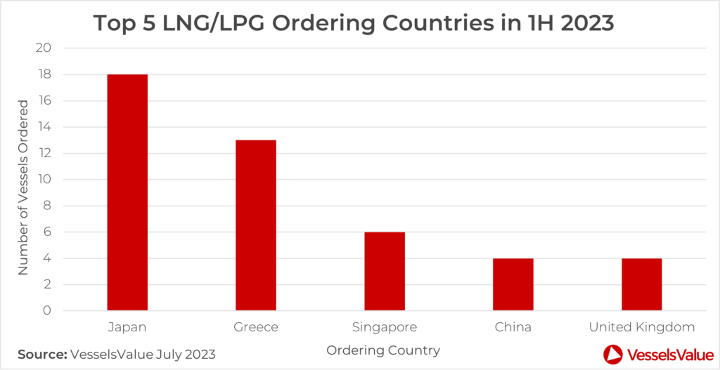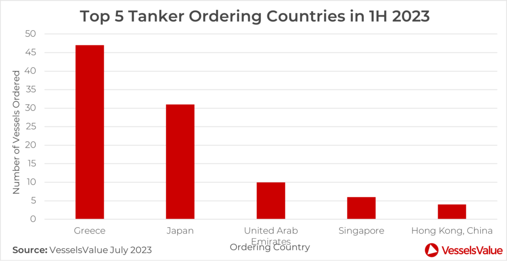 Greece has been the top nation for ordering Tankers once again, placing almost half of the orders in 1H 2023 at 47.9%. Japan ranked second with c.31.6% and in third place is the UAE with c.6.9%.