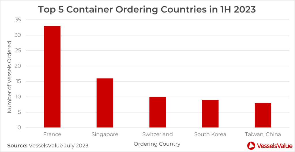 In 2023 to date, France has been the most active nation in ordering 10 new Container vessels, accounting for 38.3%, Singapore ranked second with 16 new orders, equating to c.18.6% and in third place was Switzerland with ten new orders or c.11.6%.