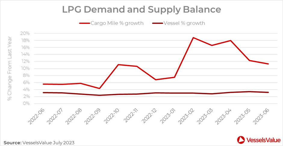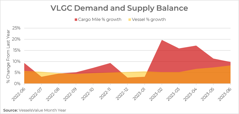 Supply growth has been rising since February and alongside a high number of deliveries expected in 2023, this could impact VLGC rates into the second half of the year, especially if demand continues to weaken.