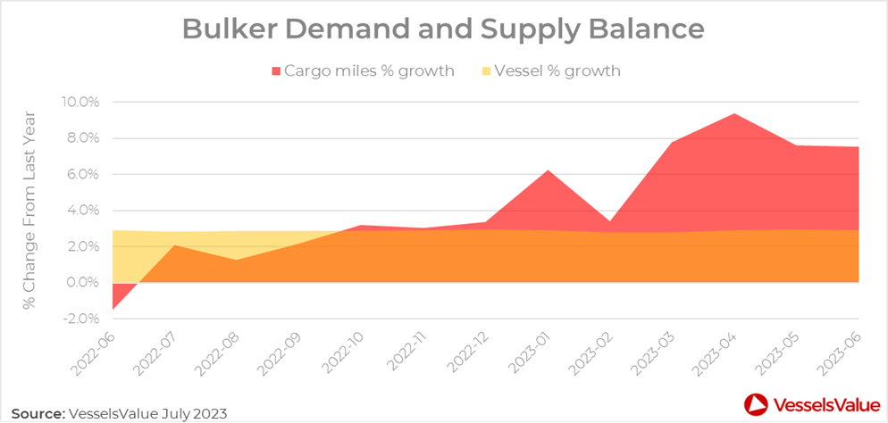 Demand growth has stayed positive so far in 2023 for the Bulker sector, as cargo miles have grown YoY by an average of 7% since January, compared to a stable 2.9% on the supply side (see Figure 5.).