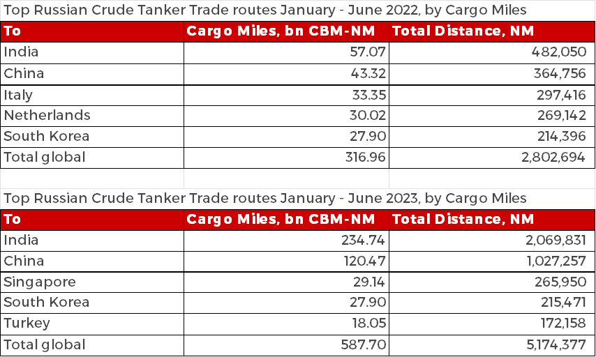 Overall, when comparing the first 6 months of 2022 and 2023, Crude Tanker cargo miles and distances have increased by 85%, which is a significant increase that will be contributing to the tightening of vessel supply in the market. These trends suggest that Russia is exporting similar levels of crude oil but they are exporting it further afield. Looking at specific routes, the top importers by cargo miles remain as India and China, with India’s share of total cargo miles from Russia over doubling YoY from 18% in the first half of 2022 to nearly 40% in the first half of 2023. This correlates with India increasing its production of clean oil products.