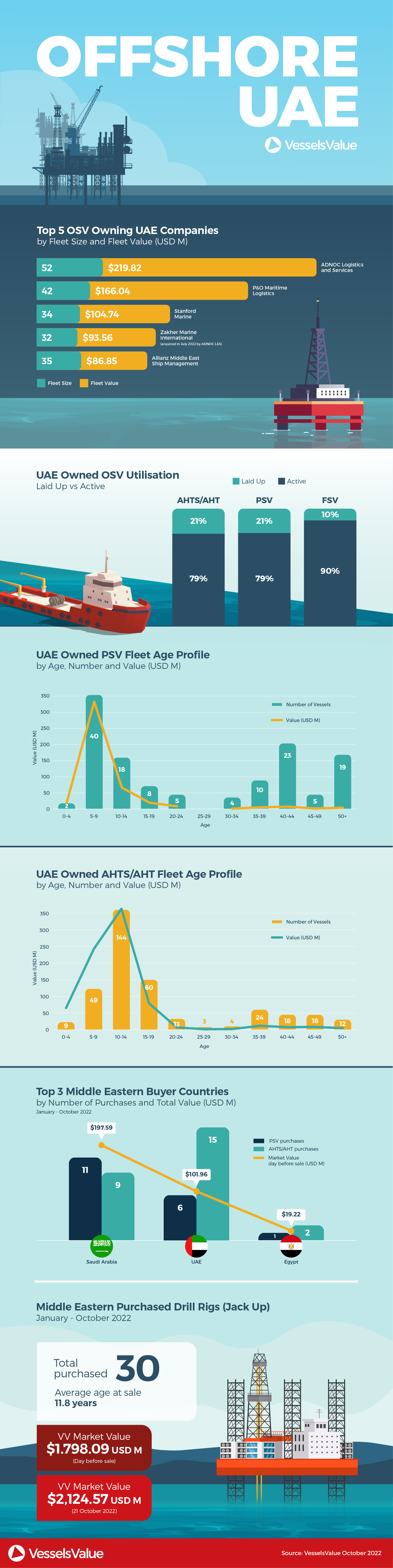 To mark the start of ADIPEC in Abu Dhabi, we have created an overview of the UAE Offshore fleet using VesselsValue data. The infographic highlights the top purchases, OSV owning companies, utilisation, and fleet age profiles, alongside top Middle Eastern buyers.