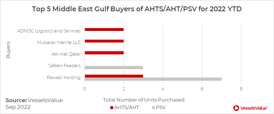 2022 has been a busy year for OSV (AHTS/AHT & PSV) S&P activity, especially during Q1 where owners found themselves rushing to acquire and reactivate tonnage, as demand was on the rise. Figure 1.1 shows the top 5 Middle Eastern buyers of OSV tonnage.