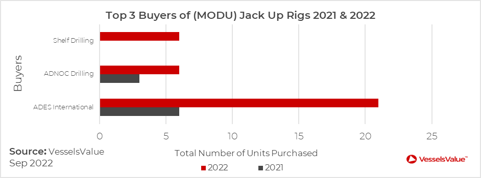 With Saudi Aramco proposing a target of 90 Jack Ups operating within the KSA region by the end of 2024, this has led to significant S&P activity by one KSA player. Ades International In 2022 alone, the company purchased 21 rigs and spent c. USD 1 Bil. Figure 1.3 shows how aggressive Ades have been on the S&P market compared to the other two major Jack Up purchases in the Middle East.