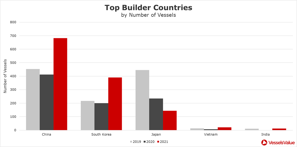 As expected, the large majority of vessels ordered in 2021 are to be constructed at yards in China, South Korea and Japan. The number of vessels confirmed in these three countries totals 1,217; 682 in China, 391 in South Korea and 144 in Japan. Other notable builder countries are Vietnam and India, with 21 and 12 vessels respectively.