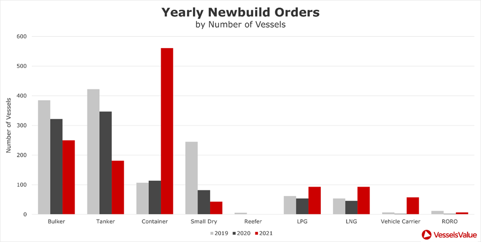 The biggest story of 2021 was the vast number of Container vessels ordered. By the end of 2020, governments worldwide began to open their economies following the first wave of Covid-19. With this came the release of extraordinary pent up consumer demand for products shipped in Containers.