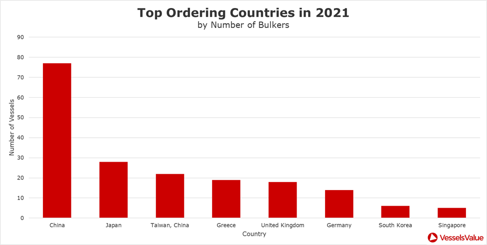 In fact, the number of Bulker newbuild orders placed dropped from 322 in 2020 to 250, resulting in a total 2021 Bulker orderbook worth USD 9.7 bil. Chinese buyers accounted for 77 of these Bulker orders, 30.8% of the total, followed distantly by Japanese buyers with 28 orders (see Figure 3). This is in stark contrast to 2019 where the Japanese surpassed Chinese orders by 18 vessels, representing a significant reduction of Japanese investment in the Bulker newbuild market.