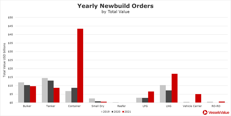 1,286 vessels were added to the orderbook in 2021, a 32.7% increase from the 969 vessels ordered in 2020. This is paired with an extraordinary growth in price for certain vessels. 2020’s total orderbook was worth USD 42.83 bil, compared to 2021’s USD 91.61 bil, a staggering 114% increase.