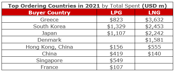 Like the Tanker market, the Greeks are leading the way in terms of 2021 Gas sector investment. They take the lead for LNG orders, totalling 18 vessels worth USD 3.63 bil (see Table 1) and are only behind South Korea’s 16 LPG orders with 14. This is a vast increase in Gas expenditure for the Greeks, compared to the 1 LNG and 4 LPG vessels ordered in 2020.
