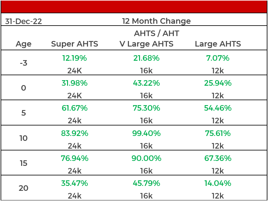 The below Matrix table shows the % change in AHTS Market Values of since the 1st of January and the 31st of December 2022.