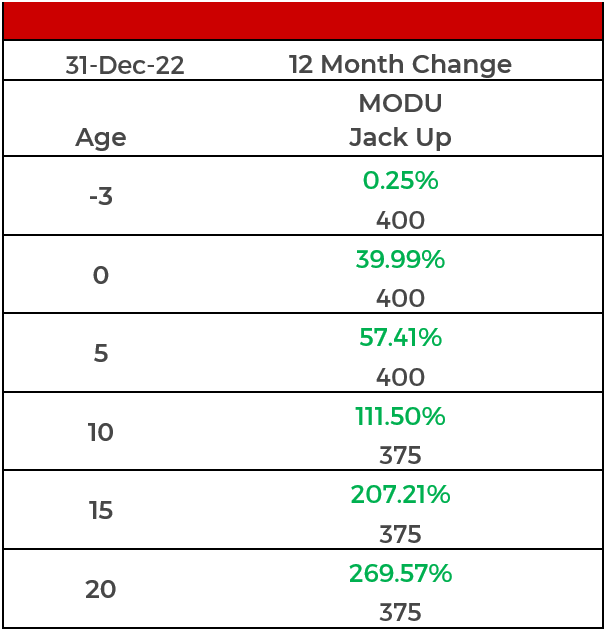 The below Matrix table shows the % change in Market Values of Jack Up Rigs since the 1st of January and the 31st of December 2022.