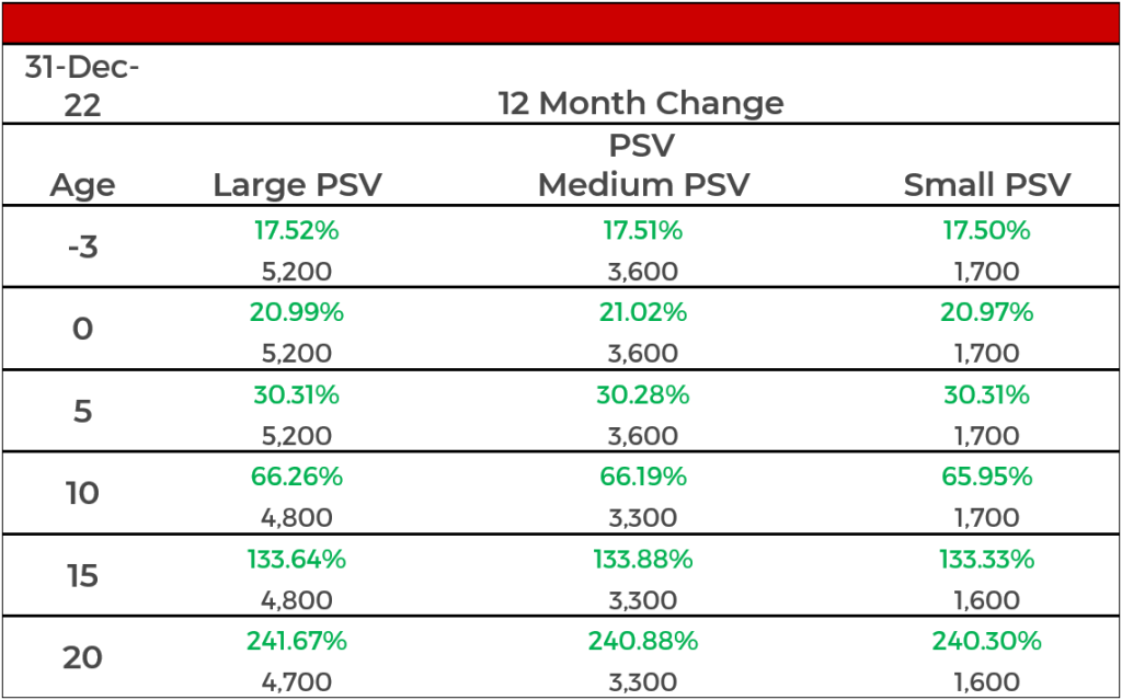 The below Matrix table shows the % change in Market Values of PSVs since the 1st of January and the 31st of December 2022.