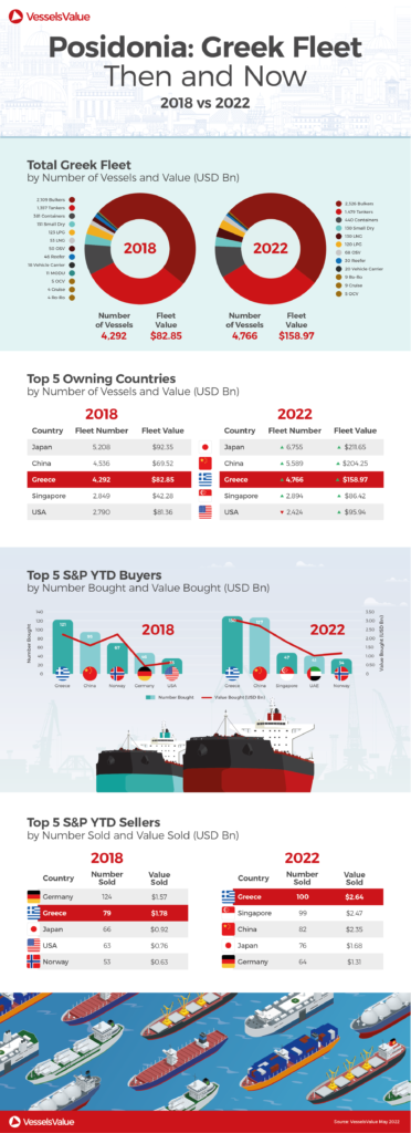 Since the start of 2022, Greece has sold 100 vessels, accounting for USD 264 billion, making them the world’s top seller of vessels, with the most popular type sold being Bulkers. They were closely followed by Singaporean owners, who have sold 99 vessels this year.