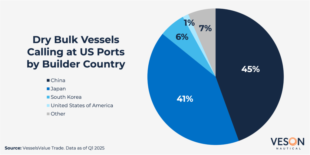 According to VesselsValue trade data, there were 3,150 dry bulk port calls in the US in Q1 2025, involving 1,609 dry bulk carriers. Among these, Chinese-built vessels accounted for the largest share at 45%, followed by Japanese-built vessels at 41%, South Korean vessels at 6%, and US vessels at 1%. Imposing substantial port fees on the Chinese fleet would reduce Chinese vessels trading to and from the US—straining Japanese and South Korean-built vessels as the US fleet cannot compensate for the shortfall. The combined effect of extra port fees on Chinese vessels and less tonnage willing to call US, would likely increase freight costs.