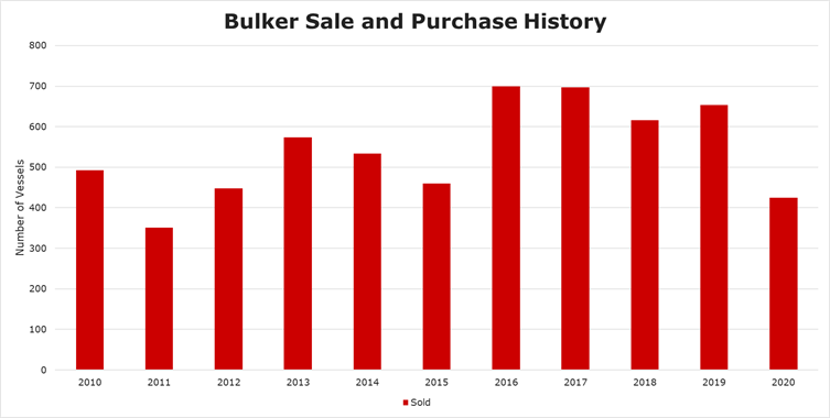 Bulker sale and purchase activity is down at 425 this year compared to 654 in 2019. The bulker market as a whole has experienced very mixed results over the last year, perhaps this lower level of transactions is a manifestation of this uncertainty. Recent positivity has been seen in China’s iron ore trade and Soybean imports, but really this recovery is to near pre pandemic levels which were not necessarily high to begin with.