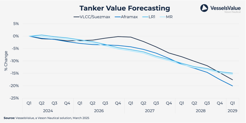 Tanker ordering activity in 2024 saw a 50% increase compared to 2023 but has slowed significantly in 2025 so far. While newbuilding prices have stabilised, they remain high by historical standards. Additionally, ongoing geopolitical uncertainty seems to be impacting current ordering trends.