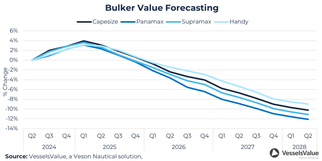 The orderbook for Bulker vessels is still comfortably low at around 10% of the total fleet, and ordering activity remains limited due to the uncertainty of the future of fuels and high newbuilding prices. We therefore expect net fleet growth to remain low during our forecasting period.