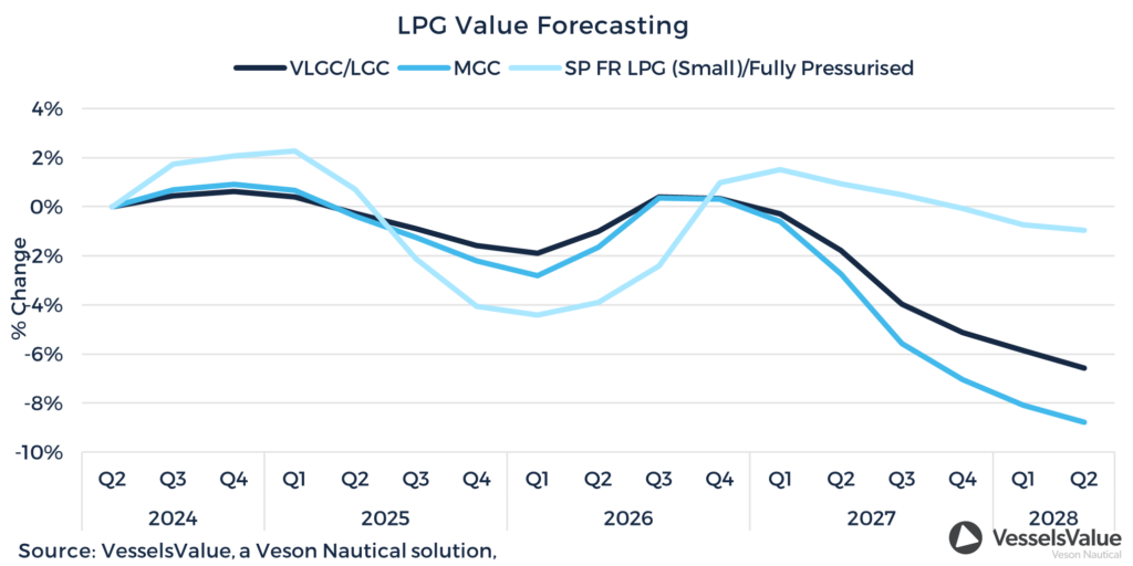 Market players are still ordering VLAC’s and the orderbook has reached 43 vessels with several vessels expected to be delivered in 2026 and 2027. Net fleet growth for VLGC/VLAC is expected to grow 10.8% in 2024. With the current ordering activity in the past year, we expect supply growth to put pressure on earnings at the end of our forecast period.